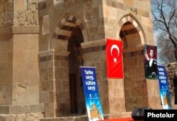 Турция - Плакаты с турецким флагом и портретом Ататюрка у входа в армянскую церковь Сурб Хач на о.Ахтамар.