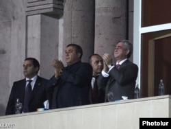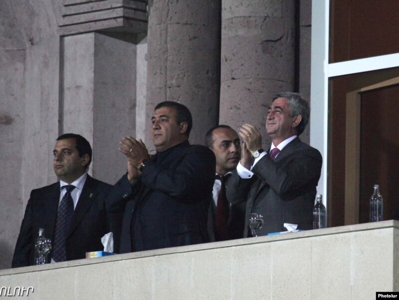 Президент Армении Серж Саргсян и президент Федерации футбола Армении Рубен Айрапетян (справа налево) на матче Амрения-Словакия. Ереван 8 октбяря 2010 г.