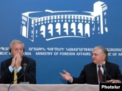 Главы МИД Армении и Швеции Эдвард Налбандян (справа) и Карл Бильдт на совместной пресс-конференции в Ереване, 14 июня 2011 г.