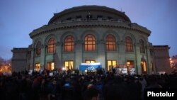Митинг завершился шествием фронта «Нет», а на площади Свободы и сейчас продолжается сидячий пикет «Новой Армении».