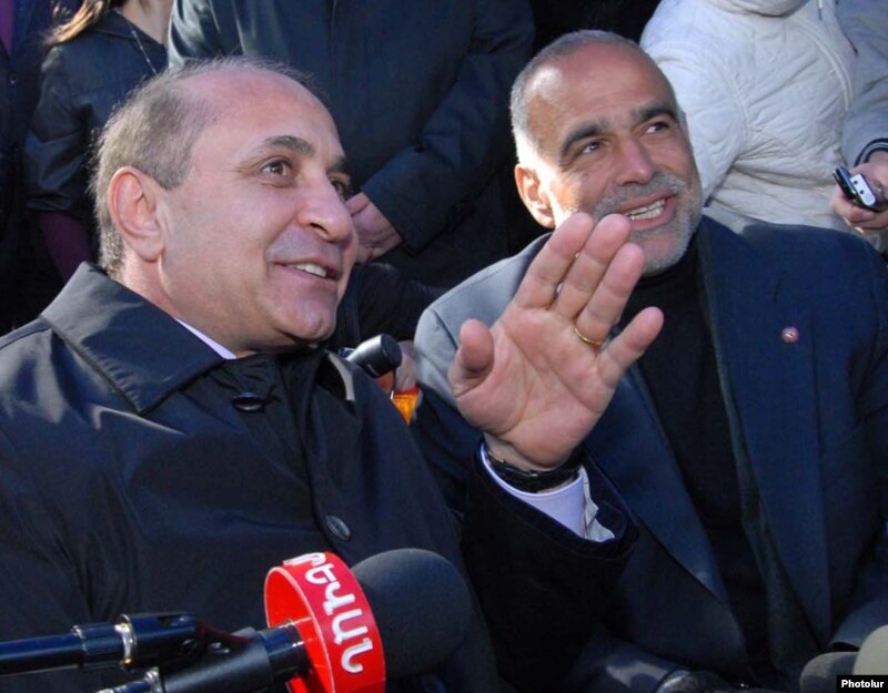 Армении – Спикер Национального Собрания Армении Овик Абрамян (слева) посещает лидера партии «Наследие» Раффи Ованнисяна, проводящего голодовку на площади Свободы, Ереван, 25 марта 2011 года.